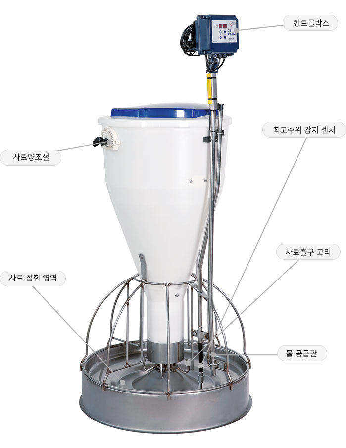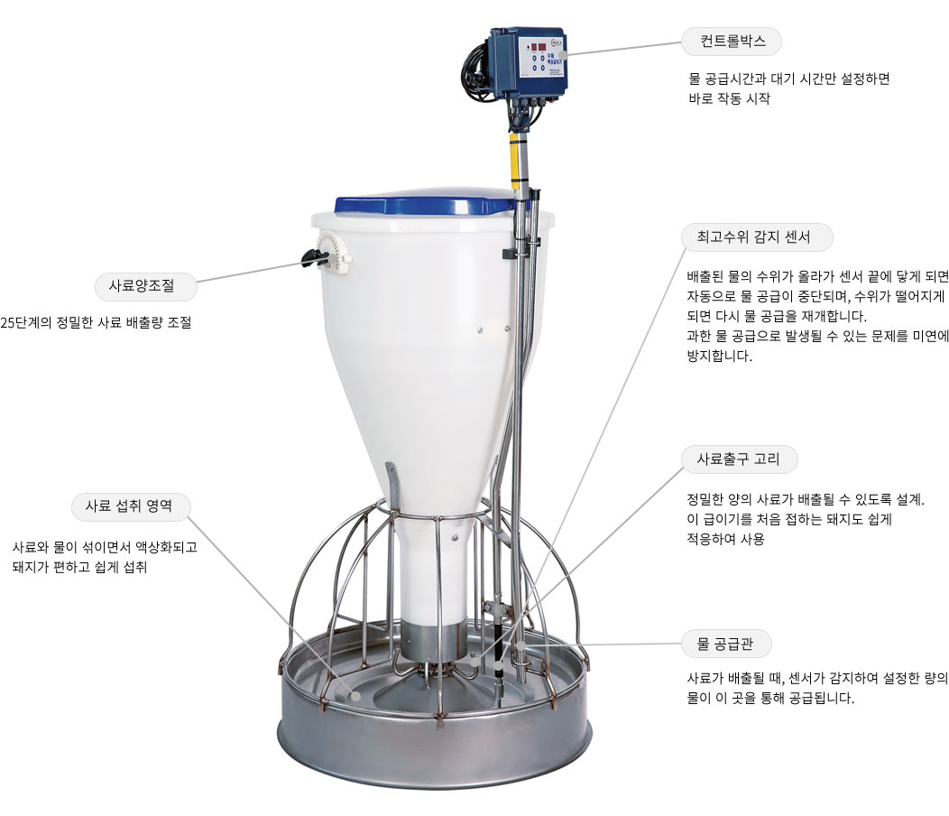 "돼지의 성장과 사료 효율을 극대화하도록 설계된 액상급이시스템 입니다. 사료가 급이기에 공급될 때 설정된 양의 물이 자동으로 함께 공급되면서 액상사료화 되어, 돼지는 사료와 물 섭취를 편하고 빠르게 하게 됩니다."